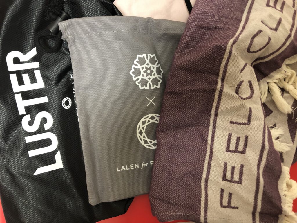 LALENのタオル、タオルっていうか…って感じだったのでレッスンでは使えないと思いますw 肌触りよくていいんだけど、飛行機の移動の時に首元に巻いたりするとよさそうみたいな生地で。ラスタータオルは色柄が好みじゃなかったので、昔スタジオで売ってたFCタオルを持ってきてたのでプログラム中はそれを使いました。あとスタジオ別タイダイTシャツは、7の水色&紫のさわやか~な色じゃなくえんじっぽい赤&紫の新色がSPRの色として発売されていて少々びっくりしました。↓の2枚目でナナさんが着てるやつ。好みじゃなかったので買いませんでした~。