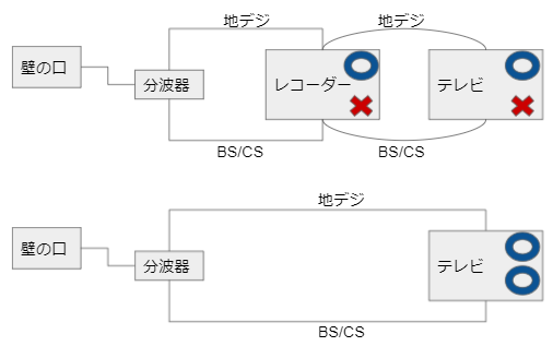 切り分けしたらレコーダーのチューナー被疑だった。せっかく図を描いたからみてって。(もちろんケーブルはテレコにしたりして確認しています)