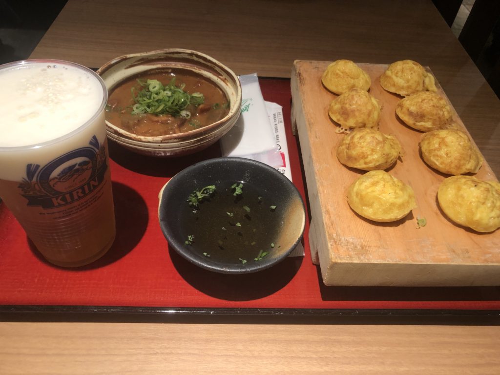 着いた日は空港のフードコートみたいとこでたこ昌の明石焼きをたべました!このどて焼きっていうの全然「焼き」じゃないですよね~でもビールが進みまくりで超おいしかったです!